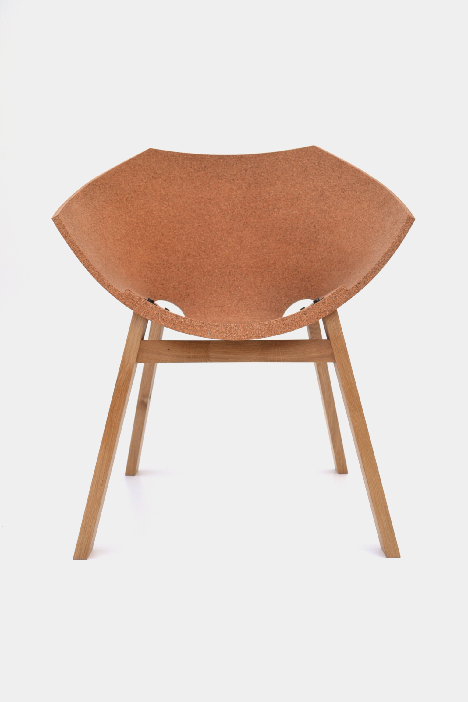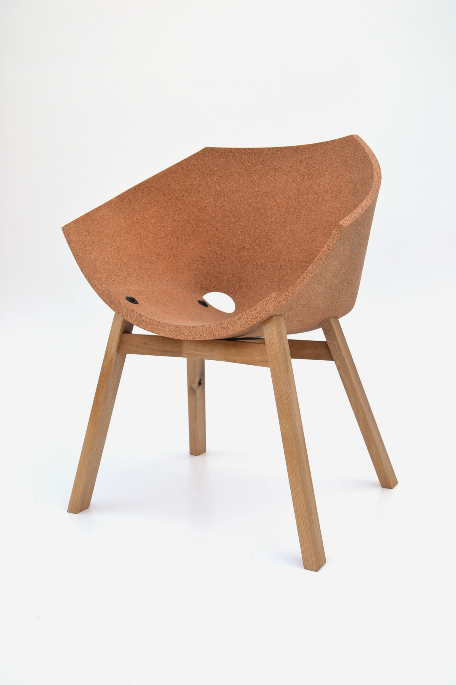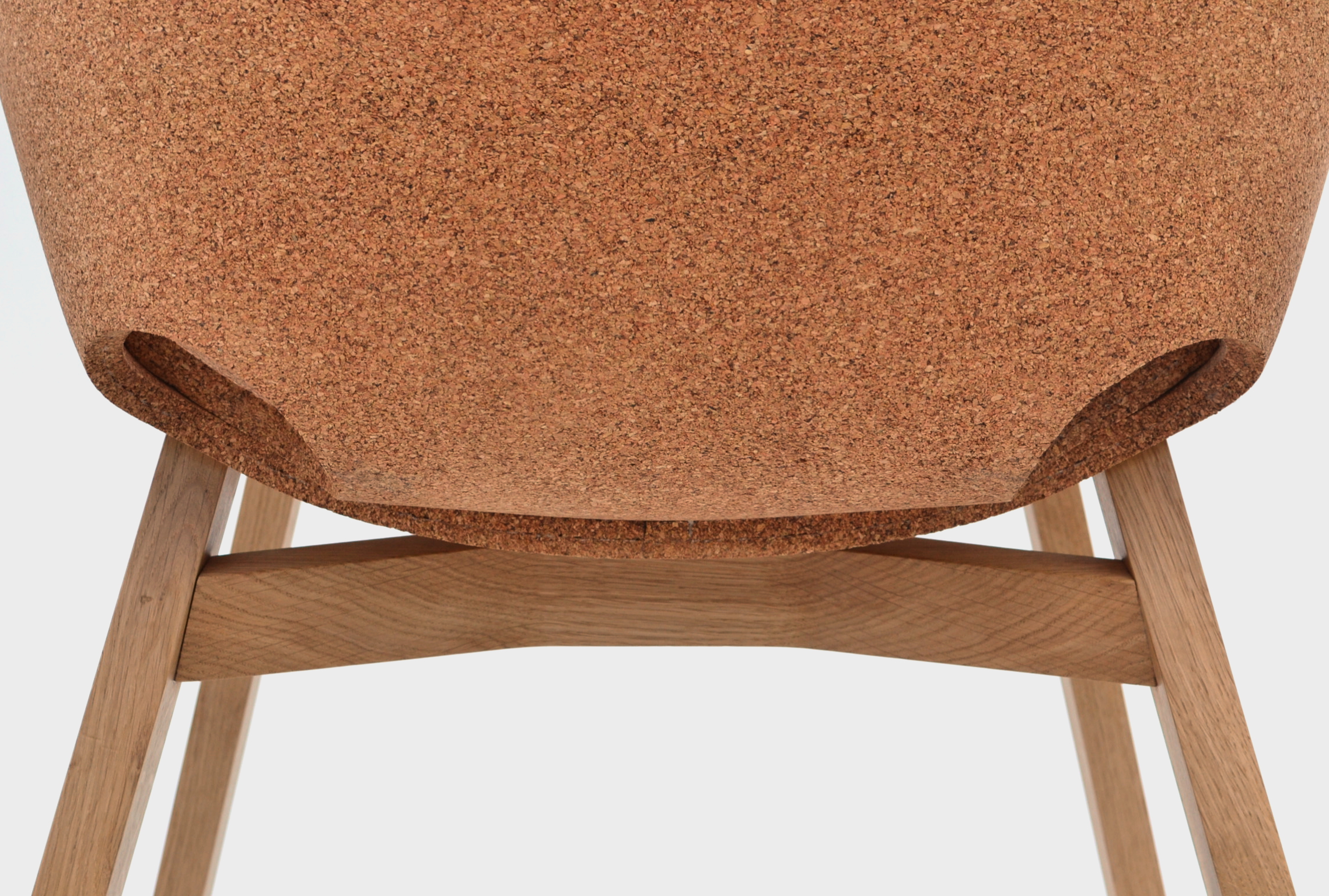 The shell rests on a solid oak stool, resulting a very attractive design. To protect the cork, we apply water-based varnish suitable for hardwearing surfaces such as cork floors, it is very flexible and makes the chair durable.