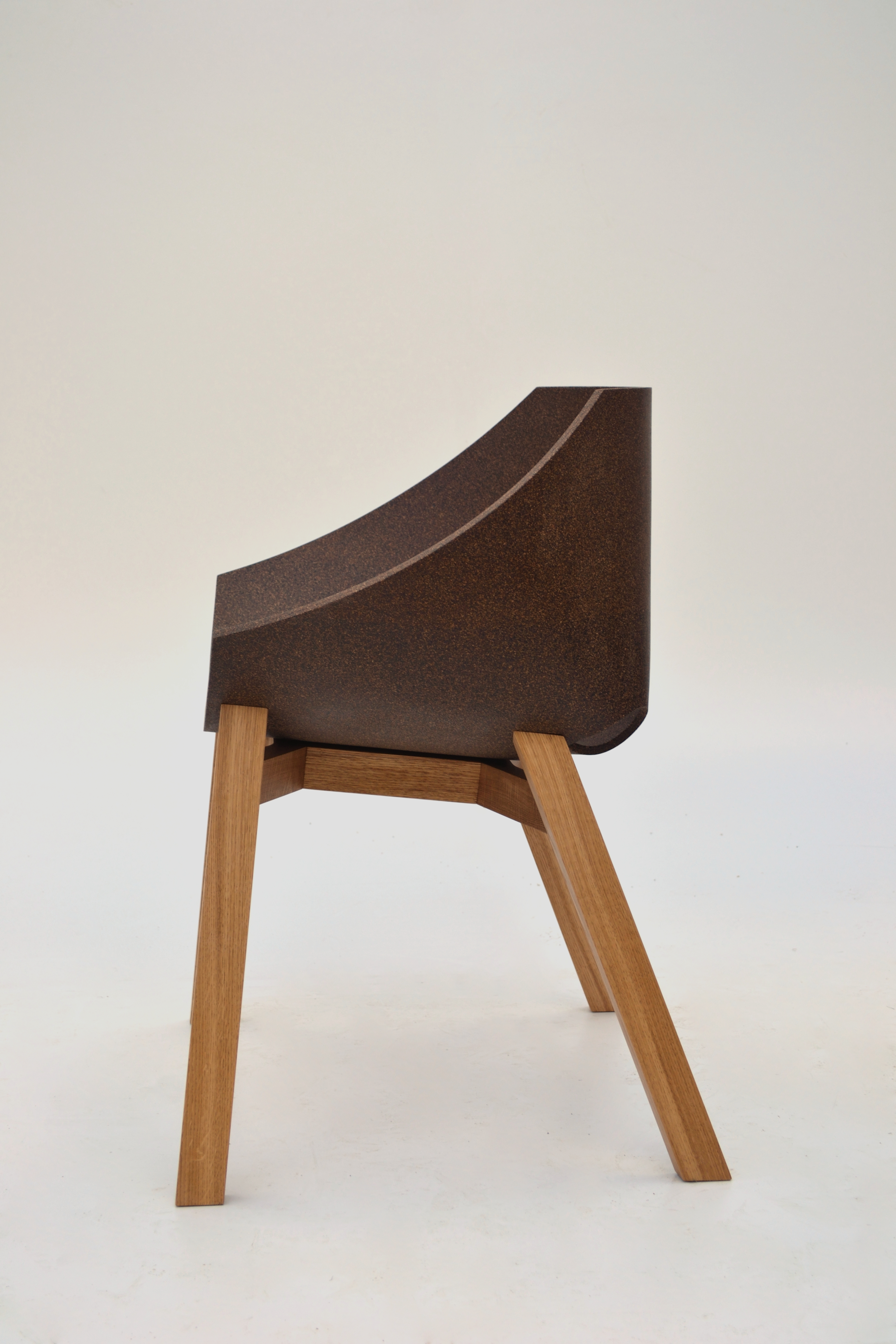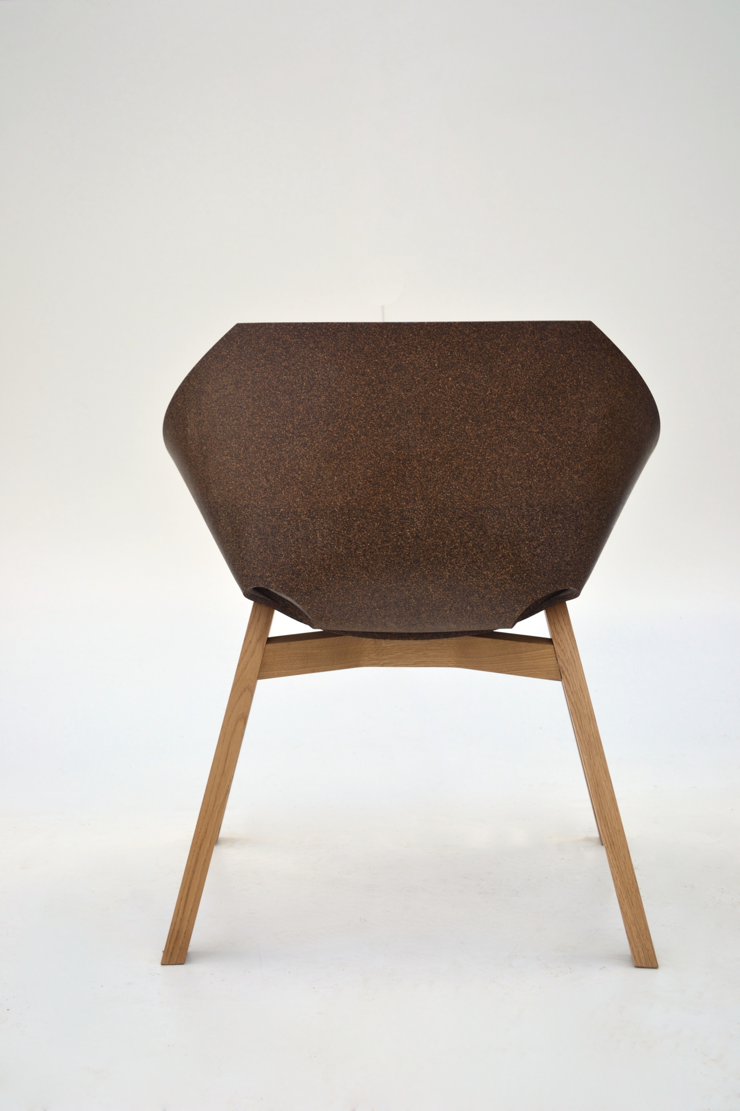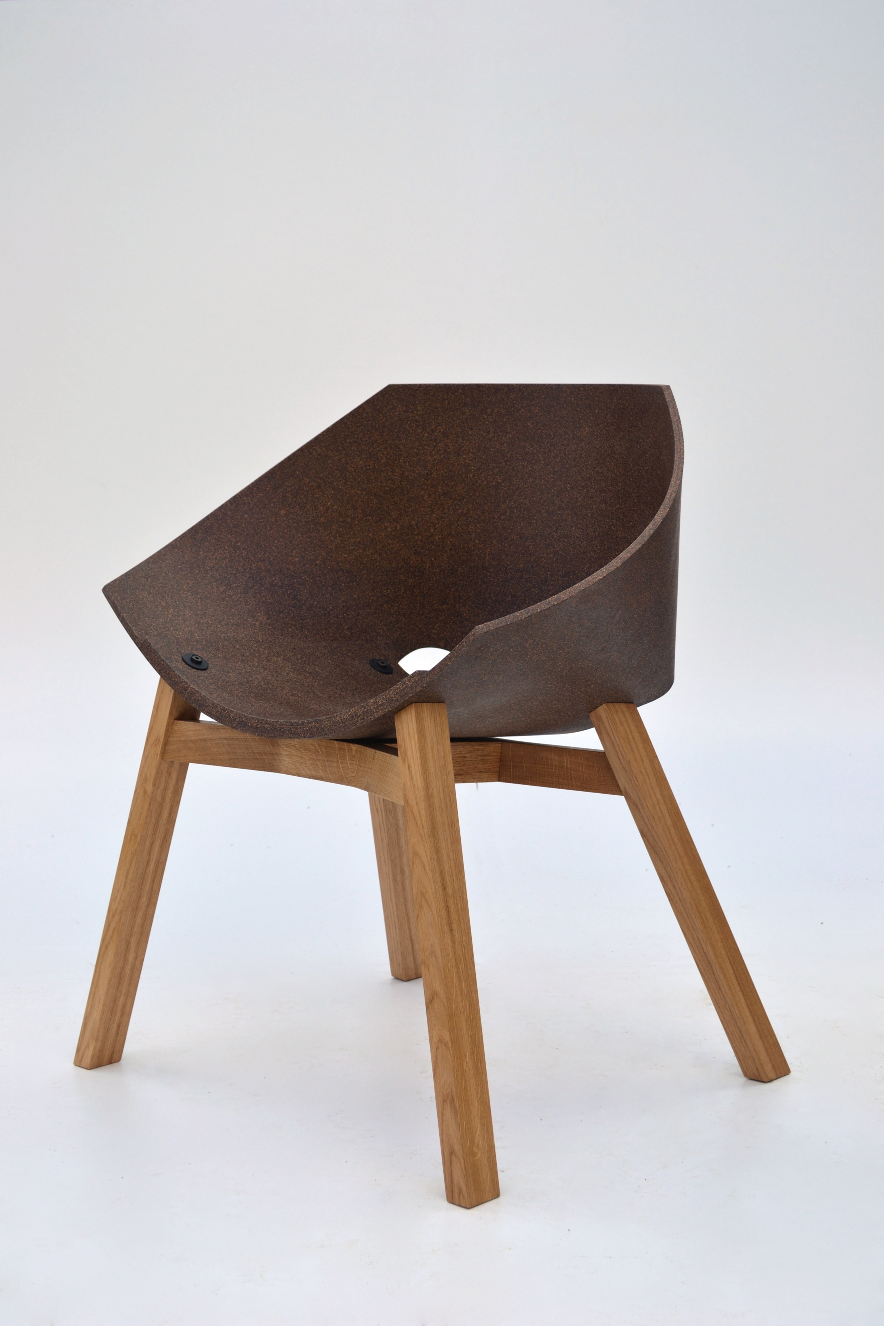 The shell rests on a solid oak stool, resulting a very attractive design. To protect the cork, we apply water-based varnish suitable for hardwearing surfaces such as cork floors, it is very flexible and makes the chair durable.