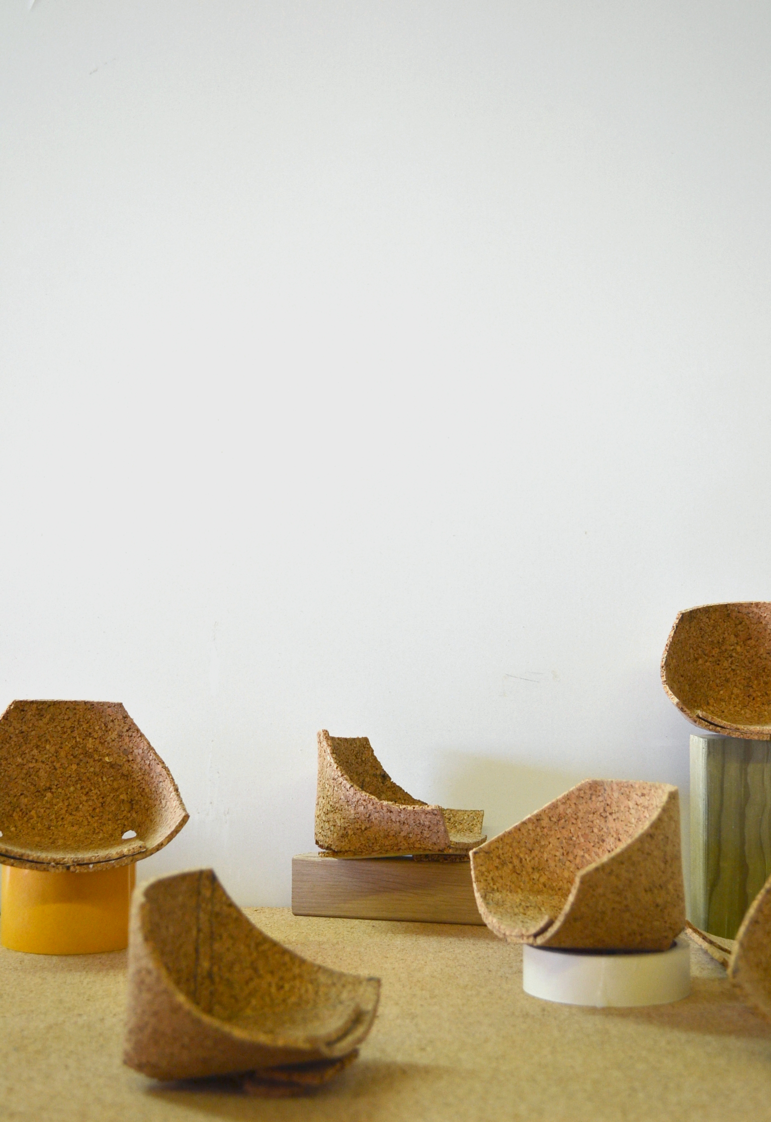 Partiendo del material en láminas, e inspirados en la técnica del origami, transformamos una forma plana en un objeto tridimensional. Para realizar este proceso con el corcho, utilizamos una técnica especial de laminado, consiguiendo así la resistencia necesaria para un asiento. Una capa de barniz al agua especial para suelos de corcho (flexible) garantiza la durabilidad, protege la superficie y evita el desgaste.