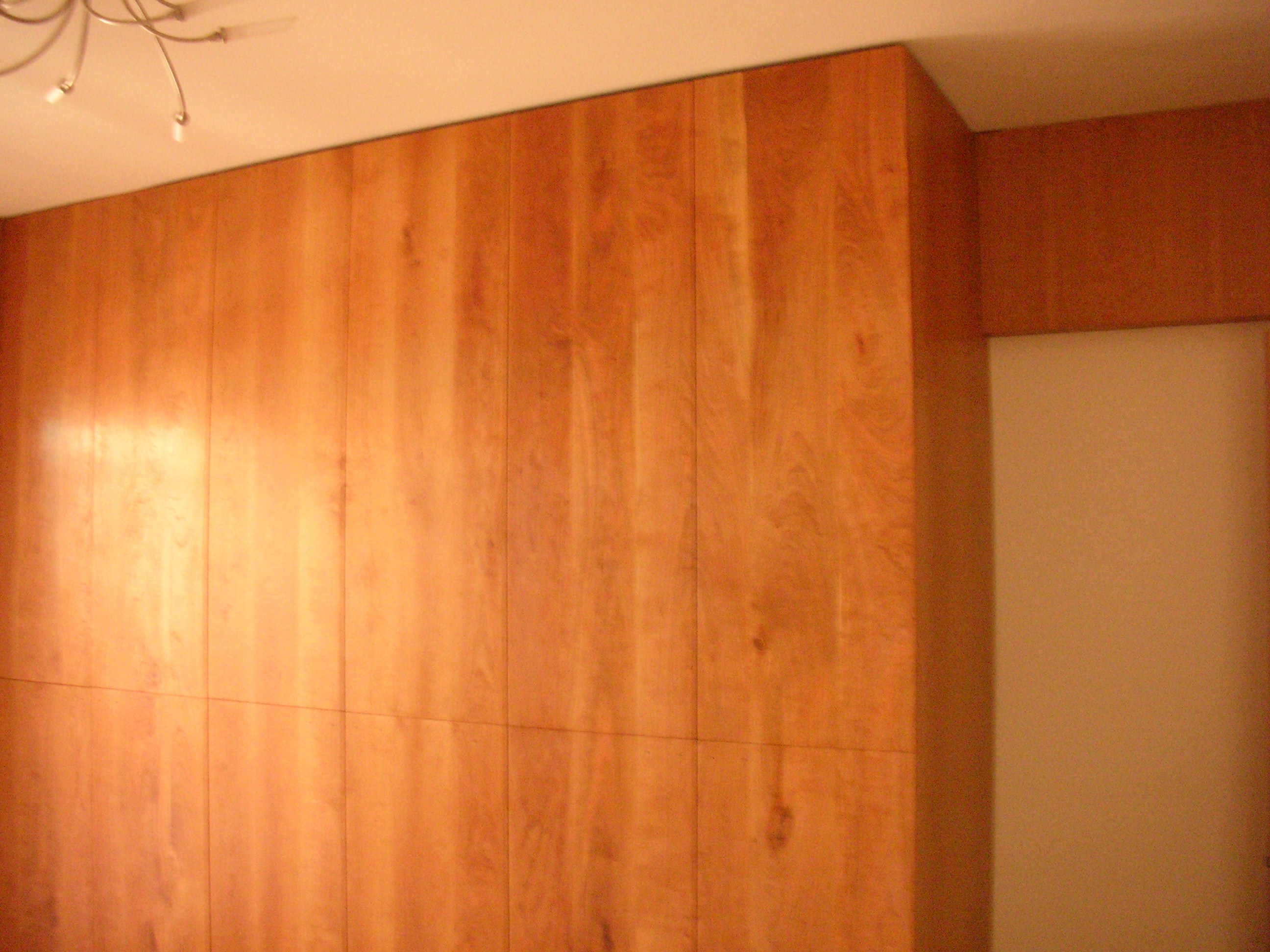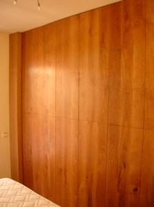 Dormitorio realizado en madera de cerezo. Construcción del armario con puertas, de suelo a techo, para dar continuidad al trasdosado vertical. Las puertas, de madera maciza, se estabilizan mediante costillas trasversales.