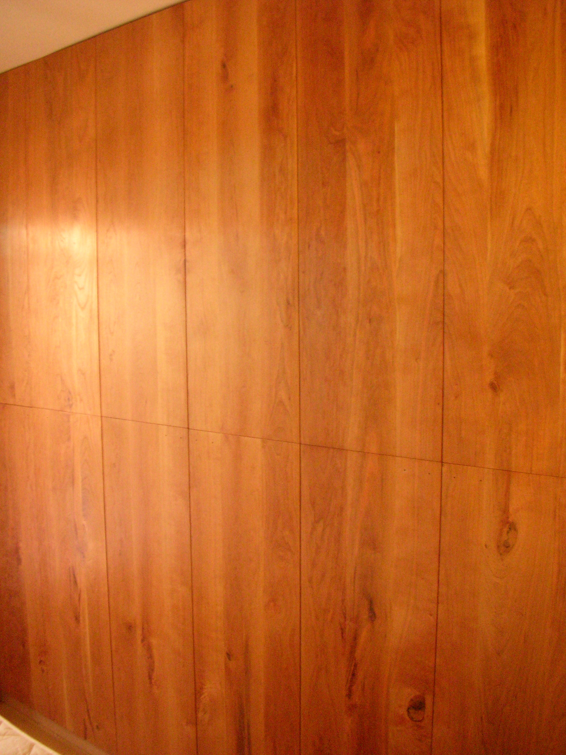 Bedroom made out of cherry. Wardrobe with floor to ceiling doors to give continuity to the wall. Solid wood construction for doors, which are stabilized by means of crossribs.