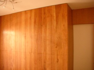 Reconversion de local comercial. Techo realizado con listones de madera de cerezo, suelo de tarima de abedul y pared curva que esconde armarios con puertas de suelo a techo,fabricadas en contrachapado de abedul, todo ello terminado con aceites y ceras naturales.