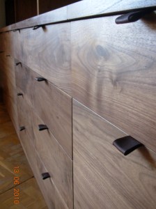 Storage solution for a livingroom. Combines solid wallnut with veneered MDF and plywood. Backpanels are made of ash, a light wood to give lightness to the whole. Pullers fabricated in leather.