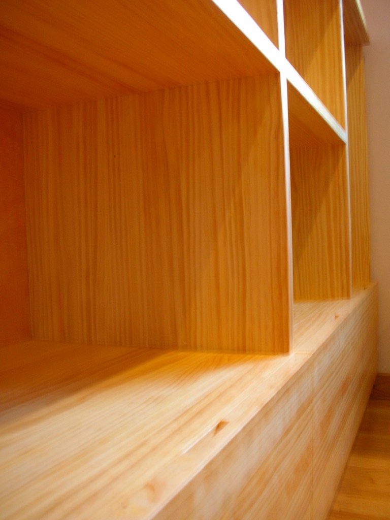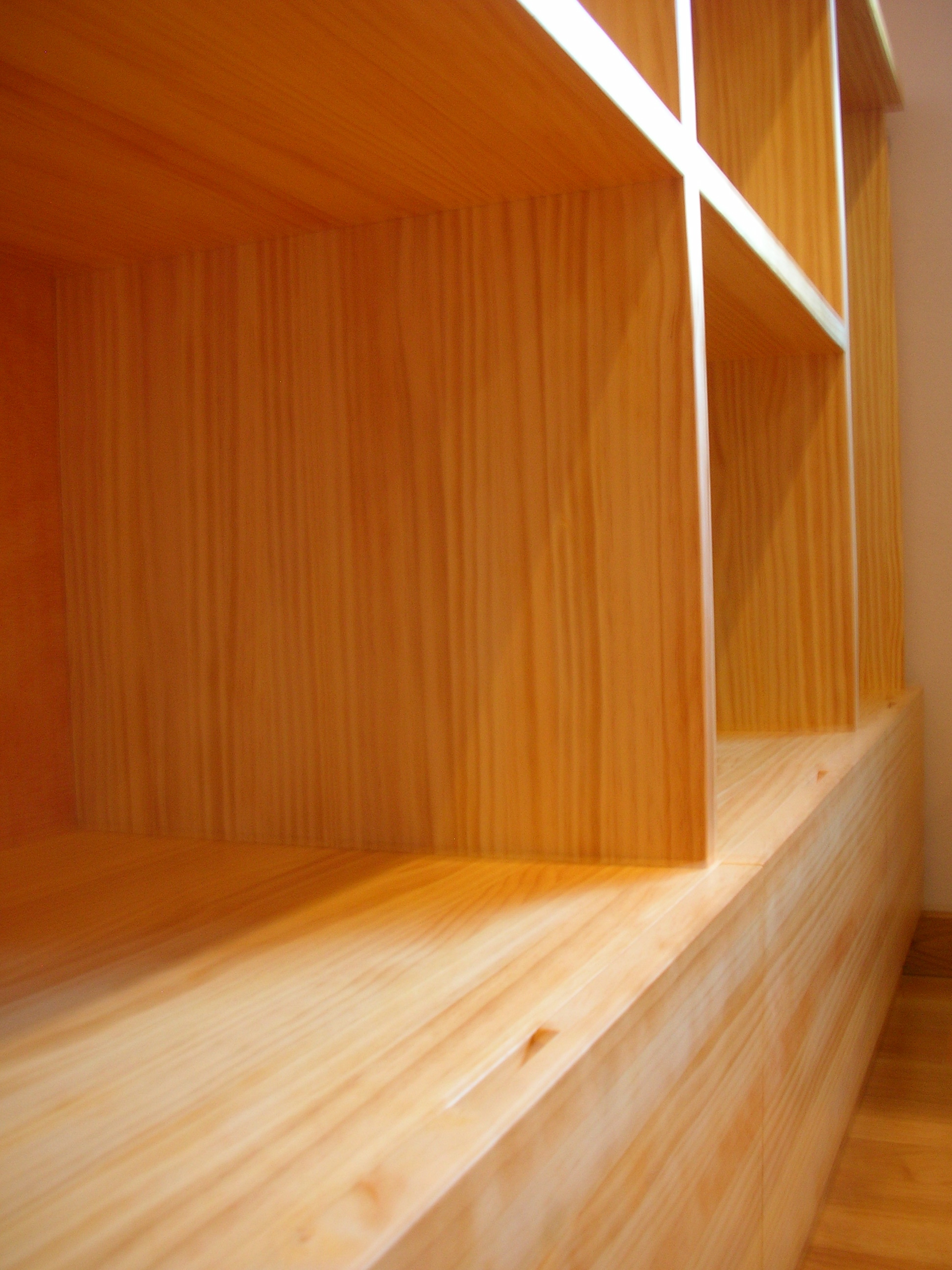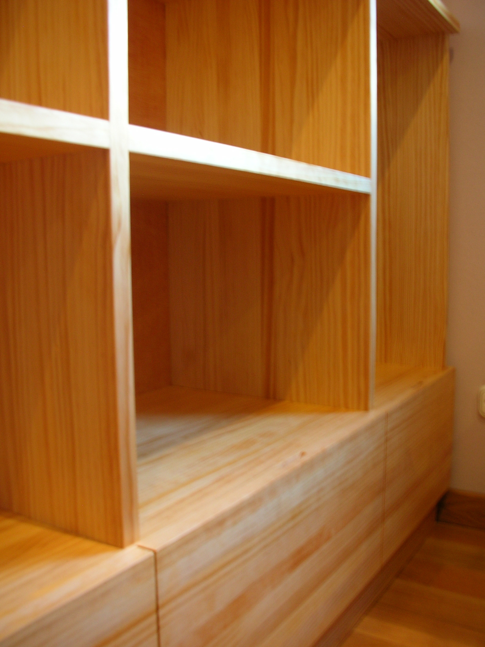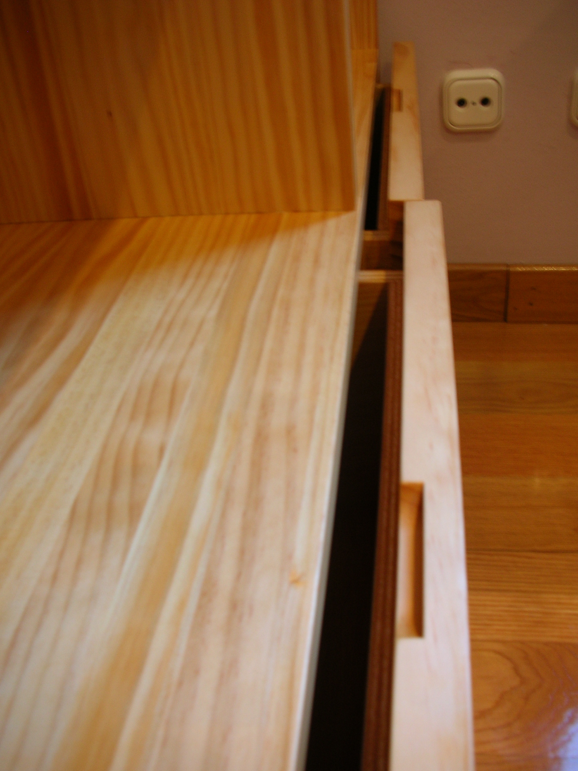 Solución de almacenaje a medida. Esconde una cama, cajonera y barras. Interior echo de DM acabado con aceite. Exterior en pino macizo acabado con aceite y cera naturales que resalta el envejecimiento natural de la madera.