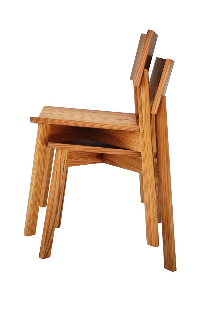 La silla se obtiene a partir de una única tabla de madera aserrada (2500x220x32mm). La estructura principal en cruz es de fabricación sencilla (espiga y escoplo). La ergonomía de asiento y respaldo se soluciona con un componente a dos aguas, simplificando el diseño al máximo.