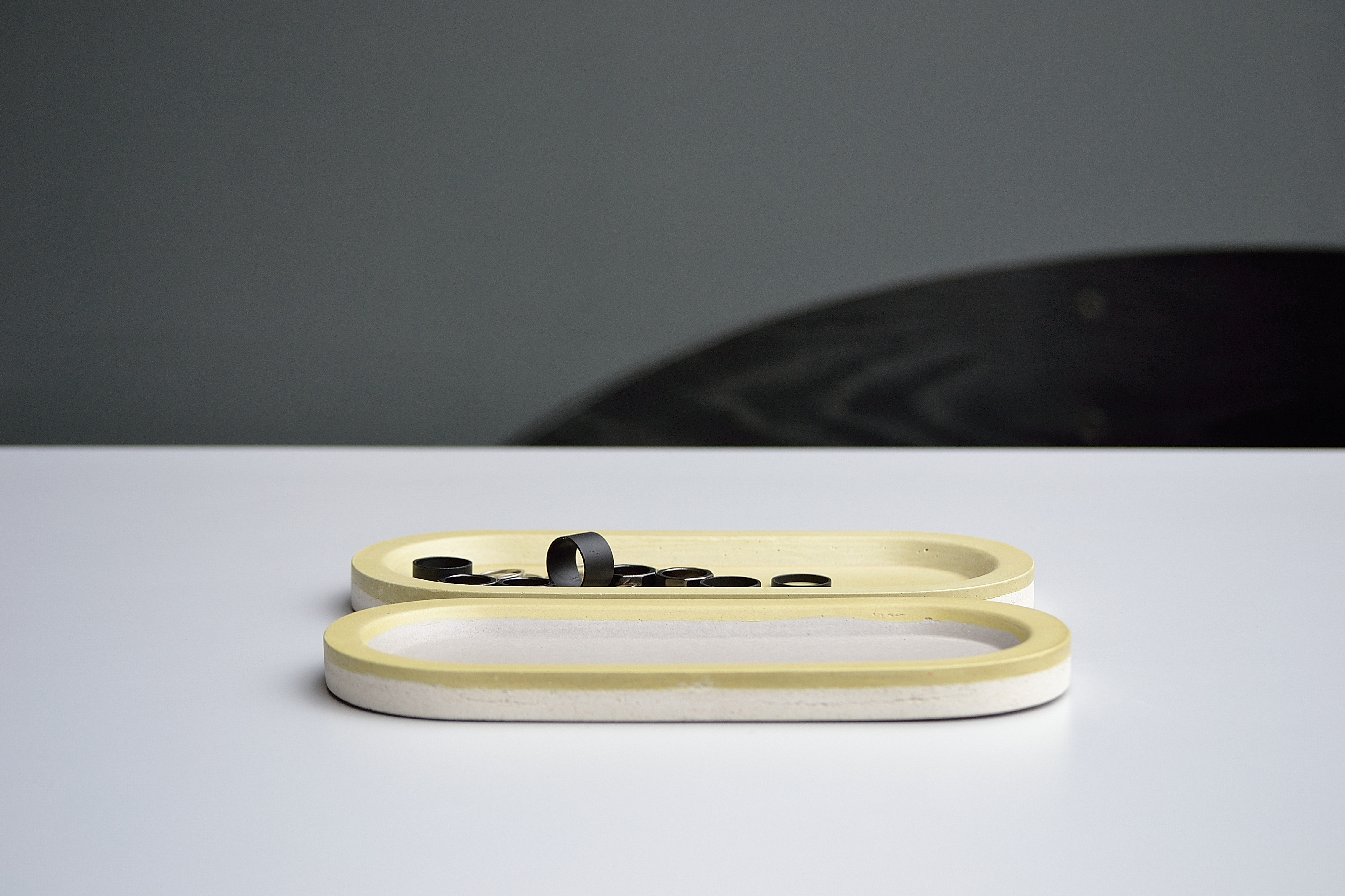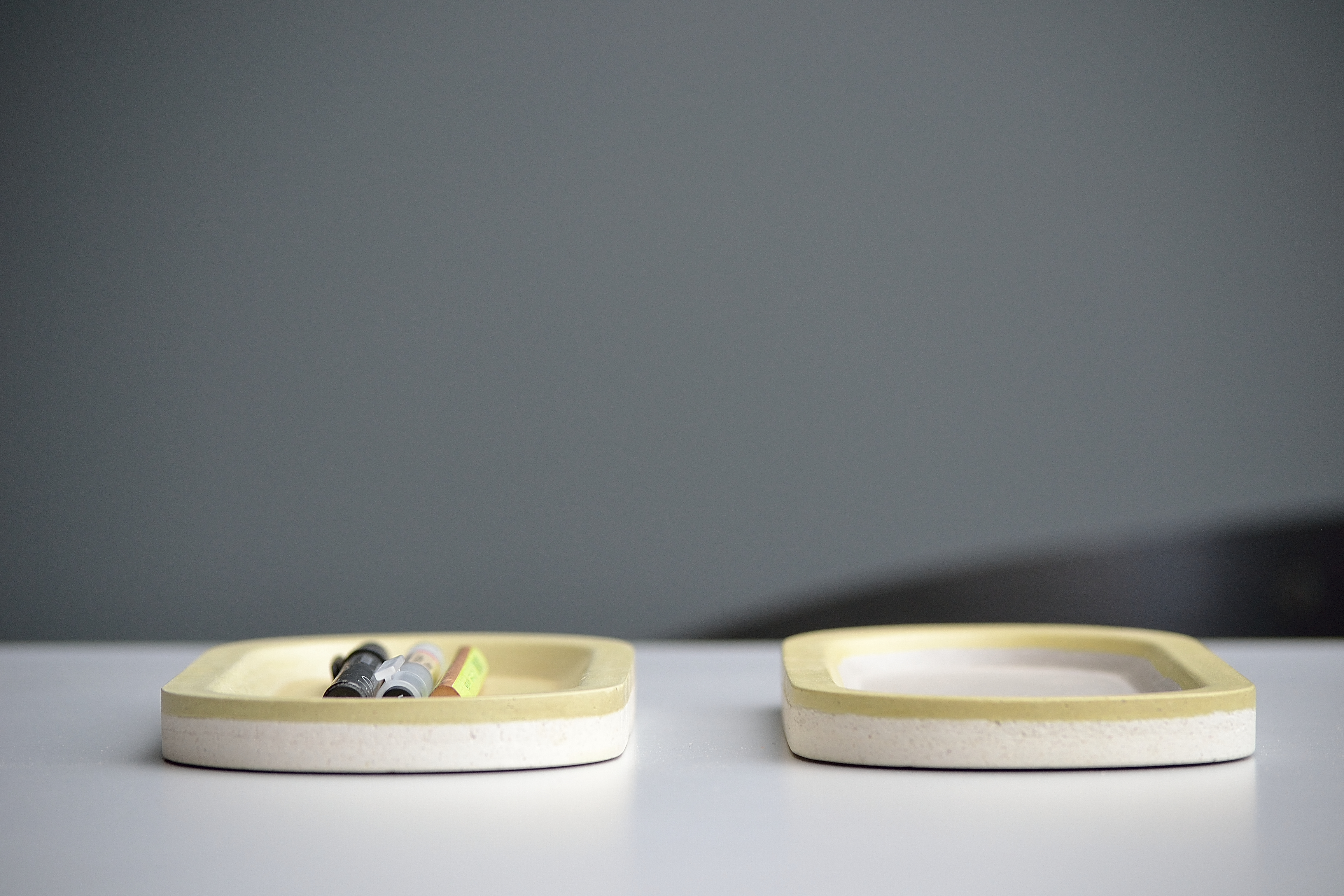 A set of containers made out of laminated cork, which we manufacture ourselves. We also colour it: the outcome is a very rich textured material.