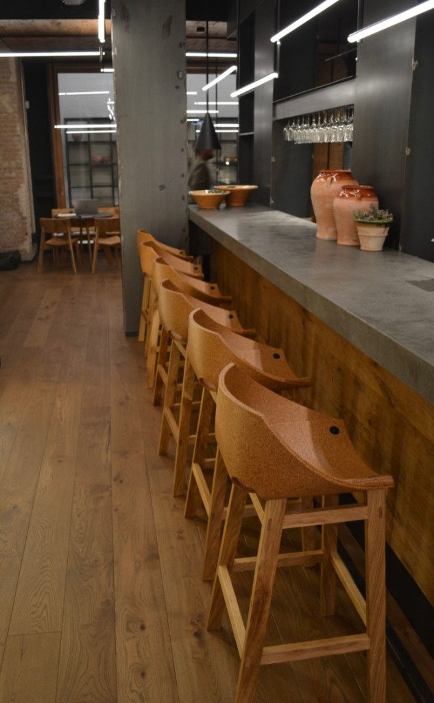 Partiendo del material en láminas, e inspirados en la técnica del origami, transformamos una forma plana en un objeto tridimensional. Para realizar este proceso con el corcho, utilizamos una técnica especial de laminado, consiguiendo así la resistencia necesaria para un asiento. Una capa de barniz al agua especial para suelos de corcho (flexible) garantiza la durabilidad, protege la superficie y evita el desgaste.