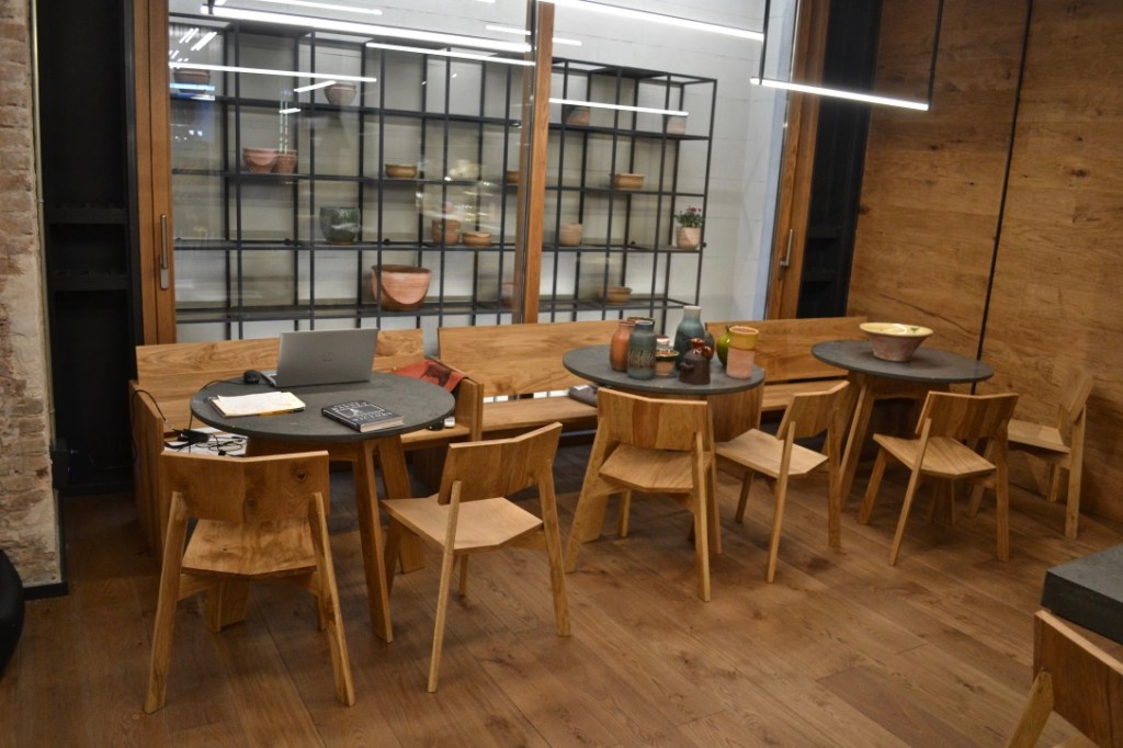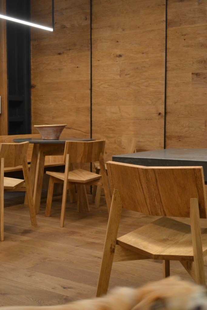 Slaughter House is an old butcher shop converted into a bookstore and café.The shopfront combines the showcase area with a cube door, becoming the preferred place of smoking. Due to its outdoor durability and other aesthetic qualities, we use atlantic cedar wood coated with natural oil and wax.