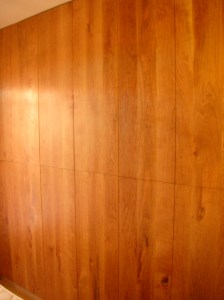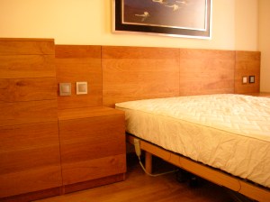 Dormitorio realizado en madera de cerezo. Construcción del armario con puertas, de suelo a techo, para dar continuidad al trasdosado vertical. Las puertas, de madera maciza, se estabilizan mediante costillas trasversales.